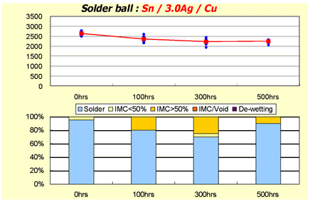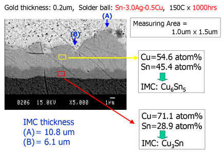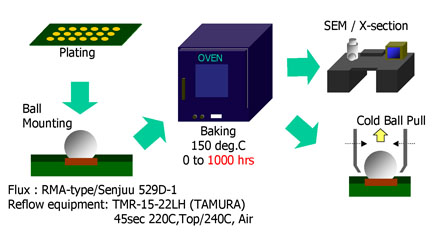 On the various ENIG and ENEPIG sample substrates, solder balls of Sn/37Pb and Sn/3.0Ag/0.5Cu were mounted, followed by heat treatment at 150oC in air for 0, 100, 300, 500, and 1000 hours