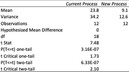 Discussion: The mean values for opens for the current and new process are 23.8 and 9.1, respectively. The two-tailed p-value is significantly lower than the alpha value of 0.05. With an alpha value of 0.05, there is only a 5% chance of rejecting the null hypothesis when it is, in fact, true (the population means are equal). The process engineer concludes that the means are statistically significant; the results in the data are not likely explainable by chance alone. The new process has statistically proven to improve inner layer yields.