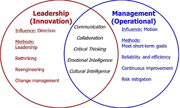 Both leadership and management are crucial for success. Leadership and management have specific individual responsibilities and shared organizational commonalities, see figure 1. Management's focus is on operational excellence. Management does this by influencing the motion of human resources. Methods include meeting short-term goals, improving reliability and efficiency, mitigating risk, and continuous improvement. Leadership's focus is on innovation. Leadership does this by influencing the direction of the organization. Methods include visionary leadership, rethinking, reengineering, and change management. An organization needs both leadership and management. Leadership without management is mediocracy; management without leadership is disastrous.