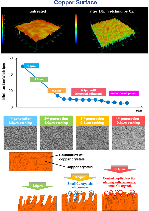 Bonding by Anchor Effect MEC’s CZ series produces a unique super-fine surface roughness by preferential etching of copper surfaces. When resin systems are applied to this super-fine roughened surface, they will flow into this roughness and after solidifying, create a very strong bond due to the ‘anchor effect’.